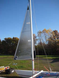 The DX Jib is larger than the standard Dart 15 jib. The furling drum is removed with the top wire strop and original forstay. The DX Jib comes with a longer forstay, dyneema halyard and block.The sail also has battens